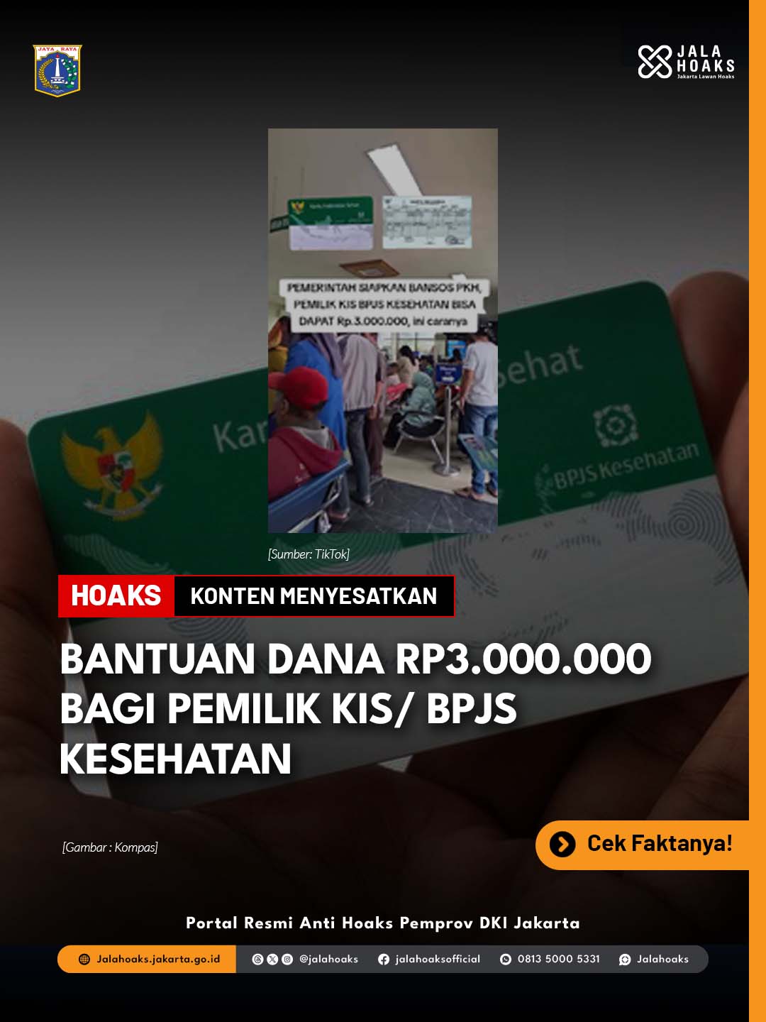 [HOAKS] - PEMILIK KARTU INDONESIA SEHAT (KIS) / BPJS KESEHATAN BISA DAPAT BANTUAN TUNAI RP 3.000.000 DARI PEMERINTAH