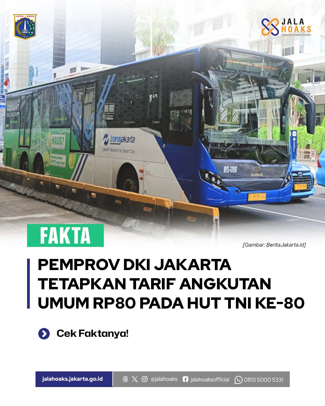 Beredar pesan di Whatsapp yang menyebutkan bahwa Pemerintah Provinsi (Pemprov) DKI Jakarta menetapkan tarif angkutan umum berlaku Rp80 pada saat Hari Ulang Tahu...