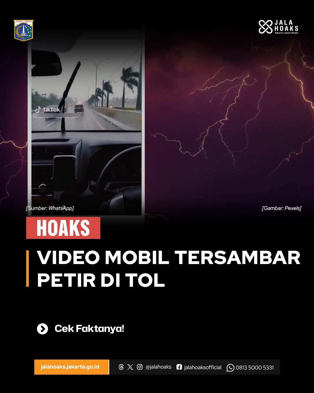 Beredar video di WhatsApp tentang sebuah mobil tersambar petir di jalan tol. Pada video terlihat marka jalan menuju Jakarta ke kiri dan Bandung ke kanan....