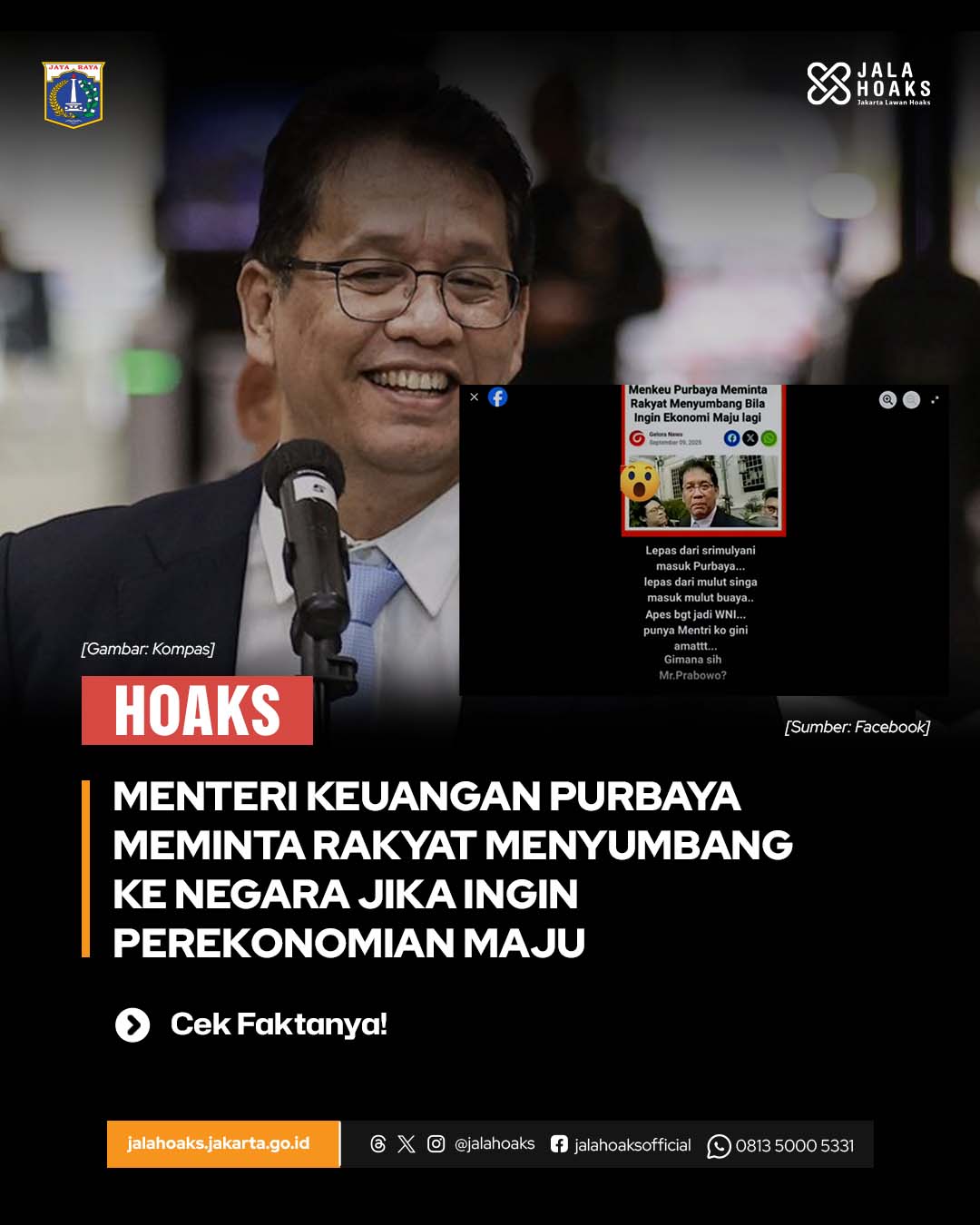 [HOAKS] - MENTERI KEUANGAN PURBAYA MEMINTA RAKYAT MENYUMBANG KE NEGARA JIKA INGIN PEREKONOMIAN MAJU