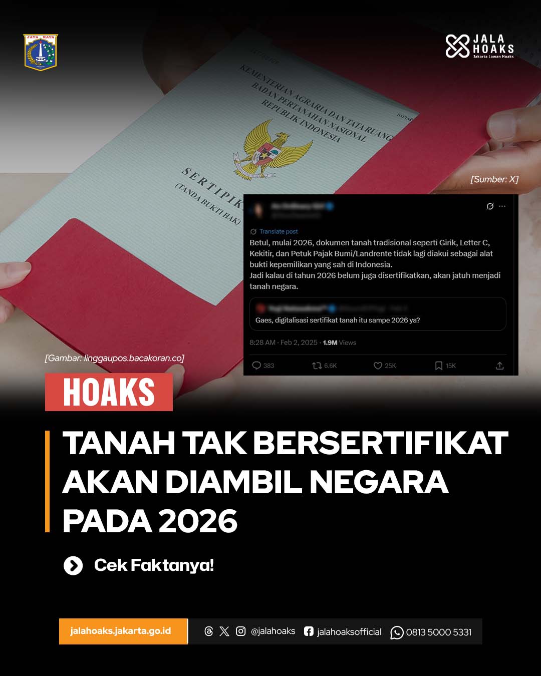 Beredar informasi di X yang menyatakan bahwa tanah tak bersertifikat diambil negara tahun 2026. ...